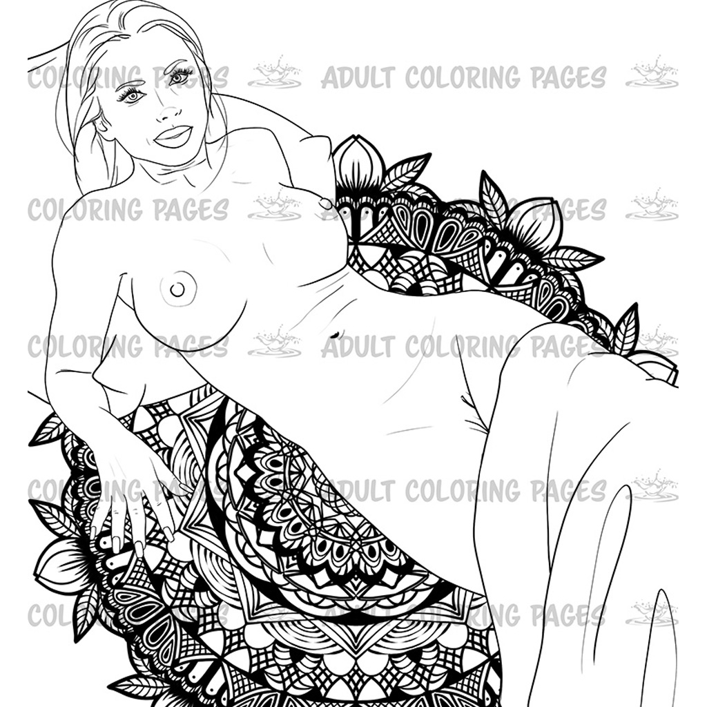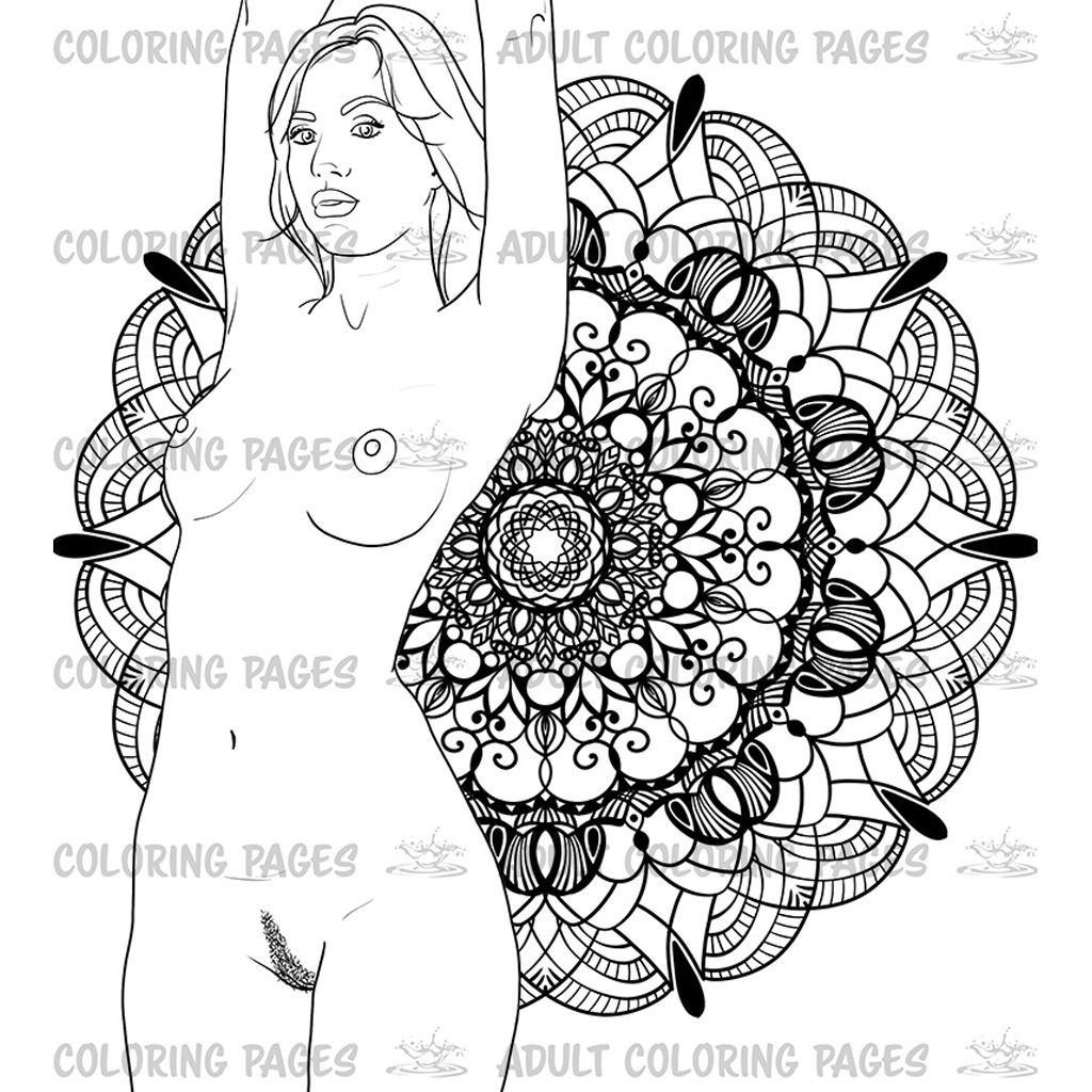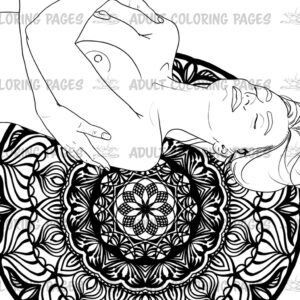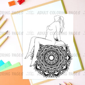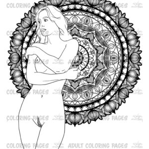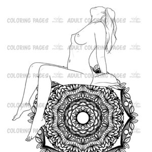 This adult coloring set features six elegant illustrations of a beautiful naked woman posed against detailed monochrome mandala backgrounds. Each page blends sensual figure art with the calm symmetry of mandalas, creating a unique mix of erotic expression and meditative coloring.
