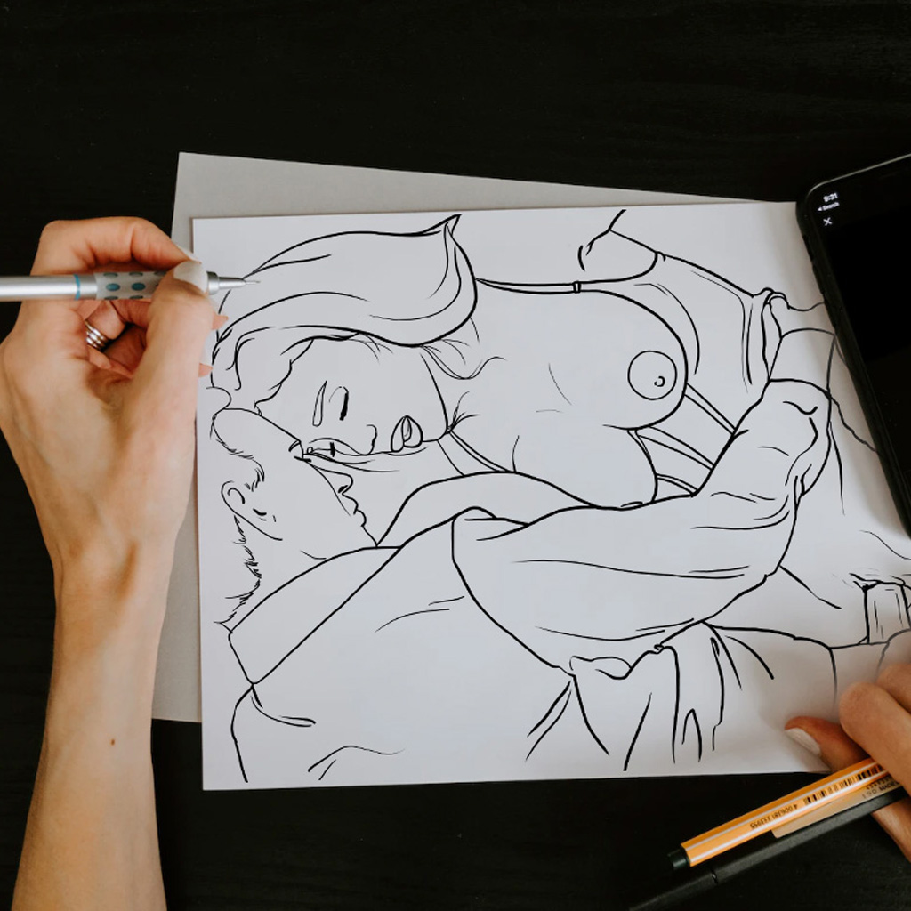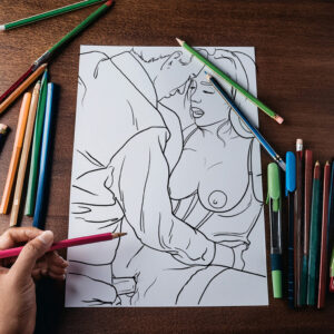 This printable adult coloring page features a bold, intimate scene designed for creative expression and stress relief. The artwork presents a close, passionate moment between two adults, illustrated with clean line work for easy and enjoyable coloring.