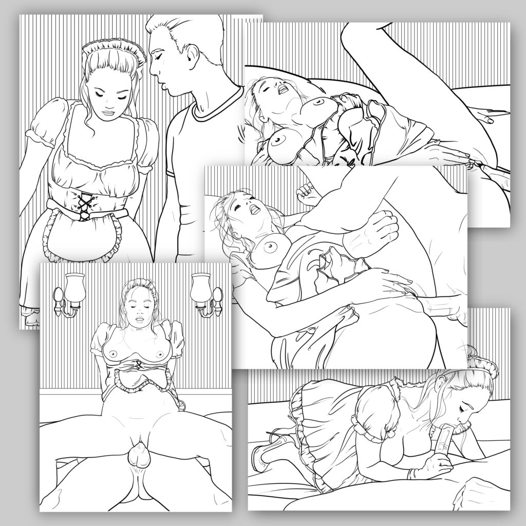 This set blends elegance with erotic tension: from the maid’s shy glances and delicate posture to the master’s firm presence and commanding touch. Every page is crafted to awaken imagination, allowing you to color the details of their chemistry and the subtle nuances of their dynamic.