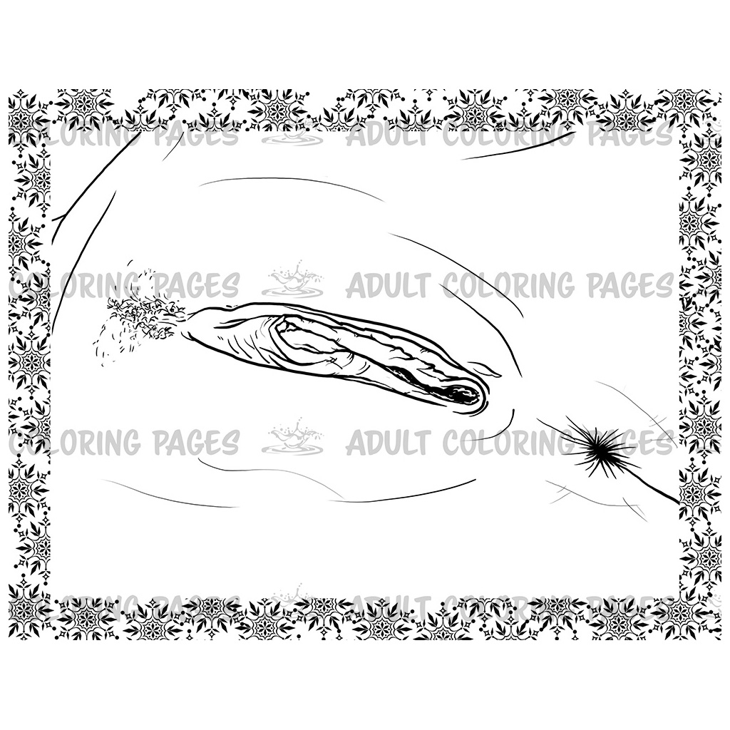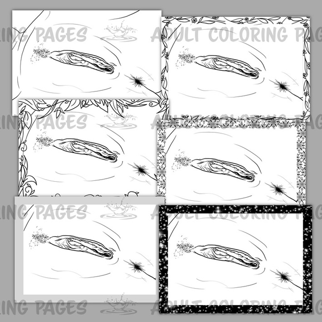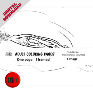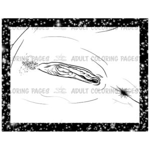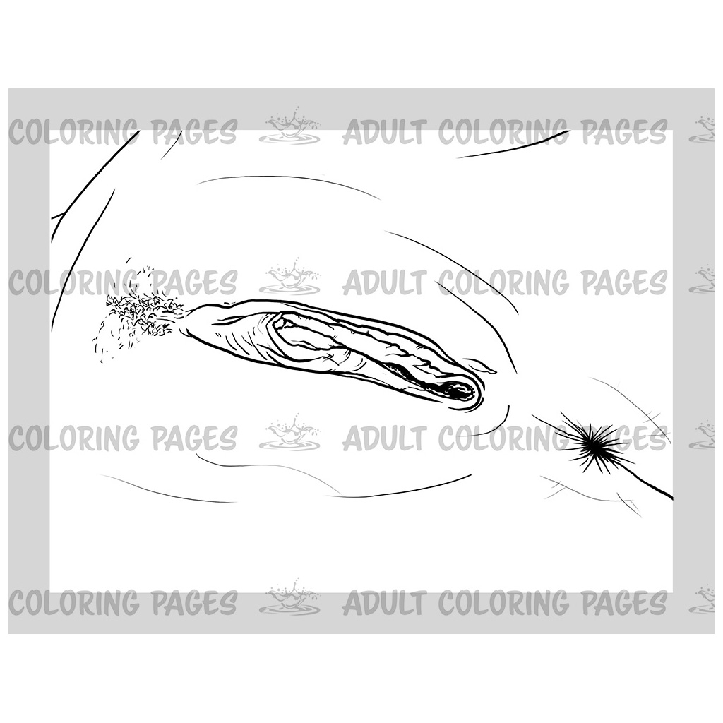 This adult coloring set features a single explicit illustration of female genitals, presented in six unique framed layouts. Each page shows the same artwork with a different frame style, offering multiple creative options for coloring and collecting.
